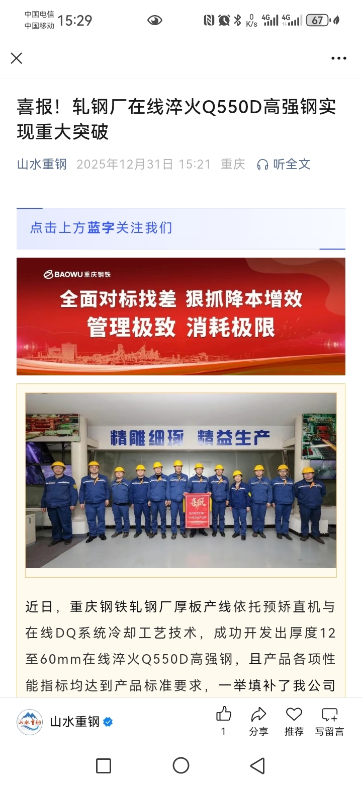 $重庆钢铁(SH601005)$ 董秘还是爱大家的。 就在刚刚突发喜报!重钢高强钢淬火Q550D成功成功突破。