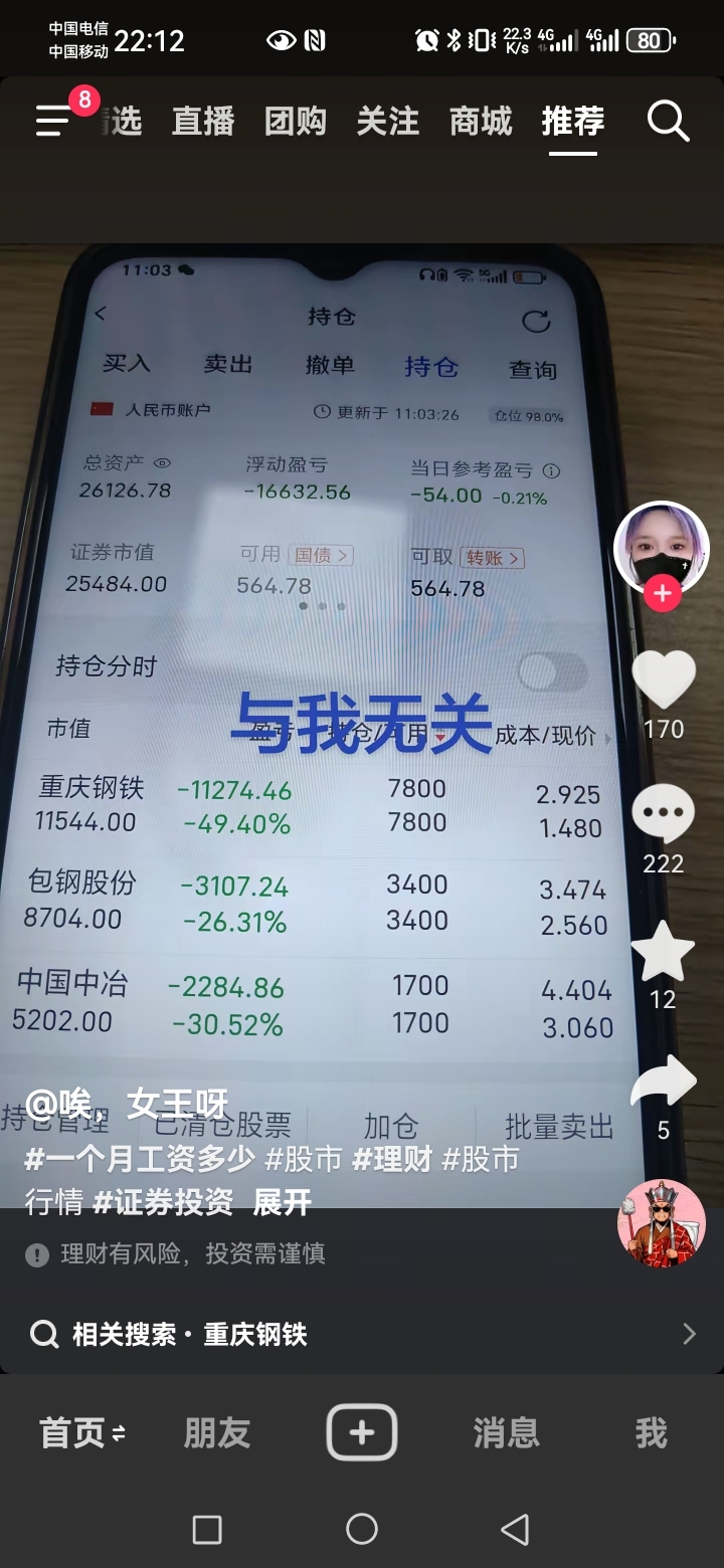 $重庆钢铁(SH601005)$ 现在知道为什么重钢不涨了,随便刷一个抖音,都有很多重钢忠实粉丝。