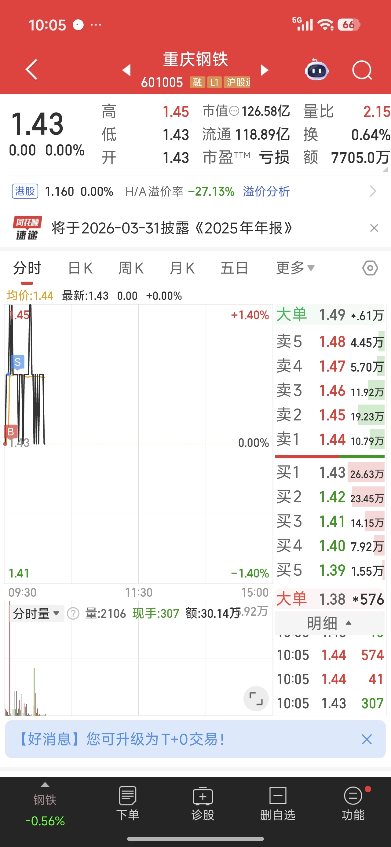 $重庆钢铁(SH601005)$ 会在1.4和1.5之间振,大家不要怕,搞起
