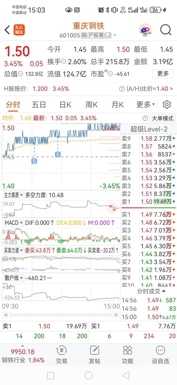 $重庆钢铁(SH601005)$ 兄弟们,我清仓了,明天大概率一字涨停。