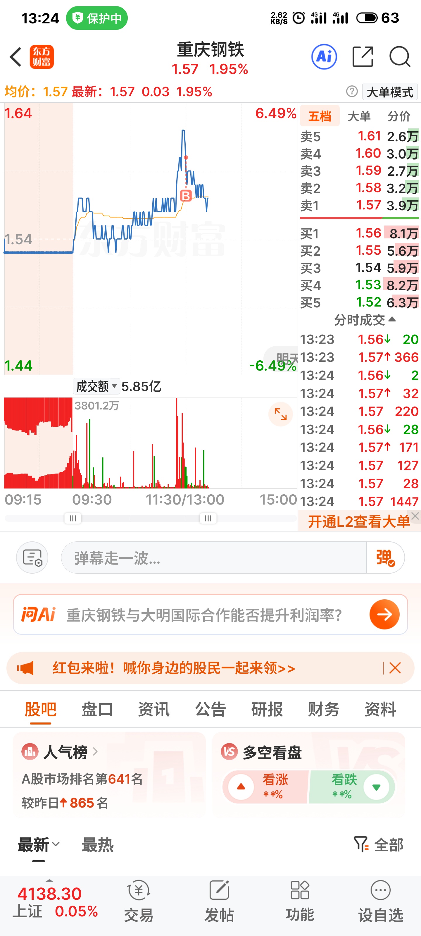 $重庆钢铁(SH601005)$ 一来就给我挂山顶了?