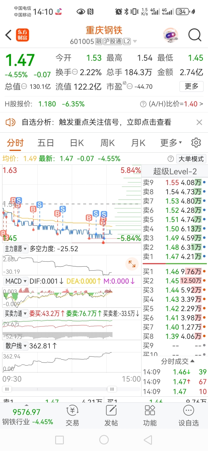 $重庆钢铁(SH601005)$ 我还治不了你!我只要赚一个菜钱就行,每次52-12=40元。5×40=200元。今天任务完成。
