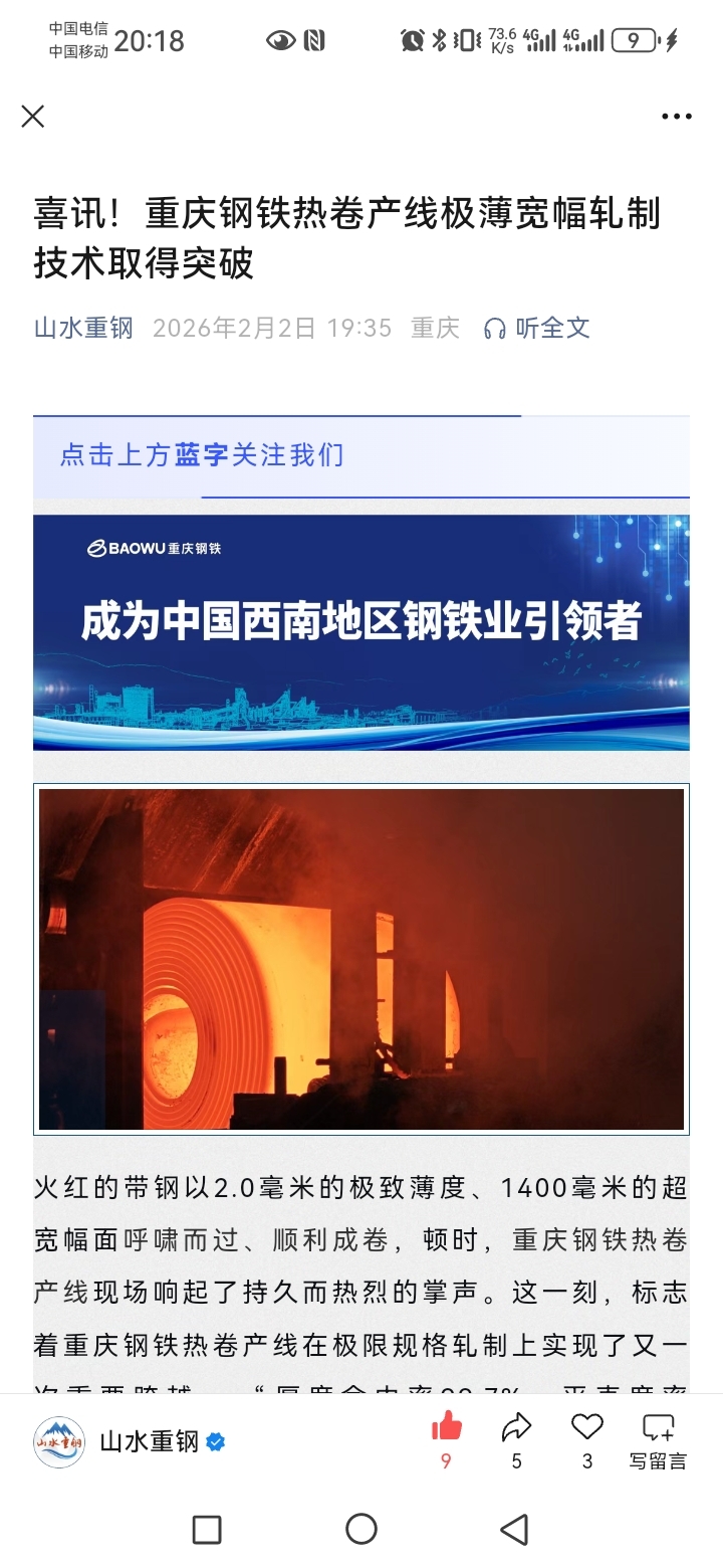 $重庆钢铁(SH601005)$ 喜讯!2毫米厚极薄热板成功量产。平直度和厚度命中率这行技术绝对重磅!明天大涨5分不过分吧。