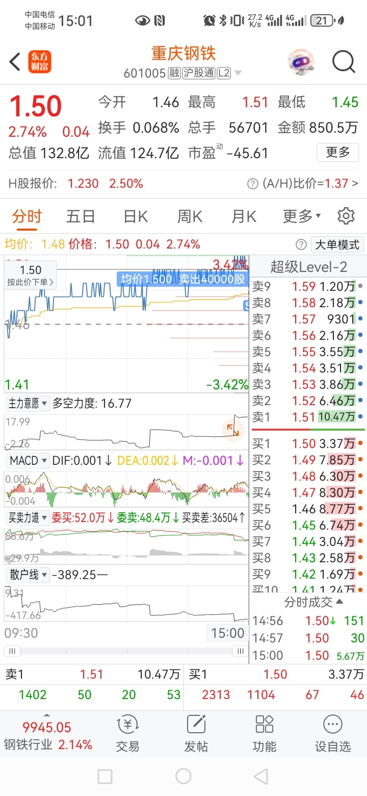$重庆钢铁(SH601005)$ 尾盘卖出40000股。还剩下20000股。祝兄弟们发财。