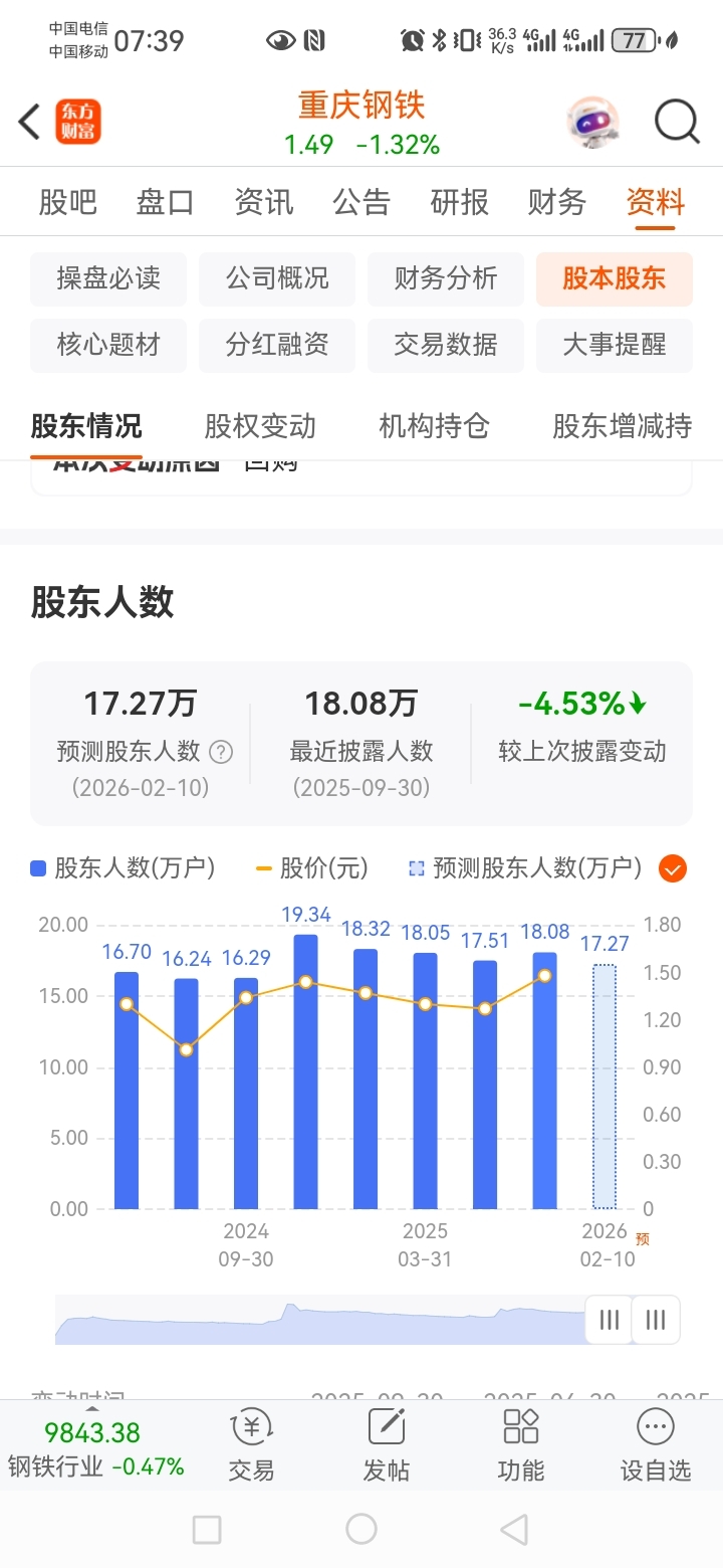 $重庆钢铁(SH601005)$ 小利空,昨天散户增加100人。