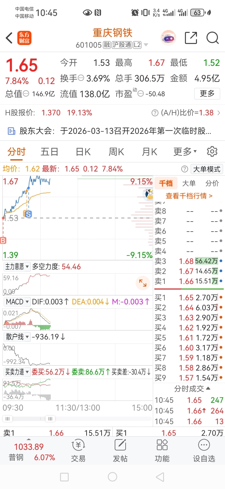$重庆钢铁(SH601005)$ 今天这个T,虽然不完美,但是还行吧。