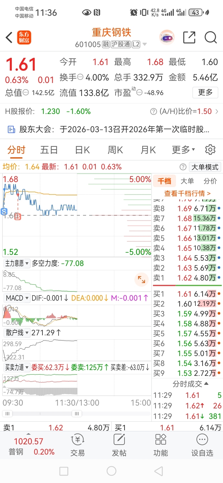 $重庆钢铁(SH601005)$ 今天又T的不完美。不过菜钱依旧到手。