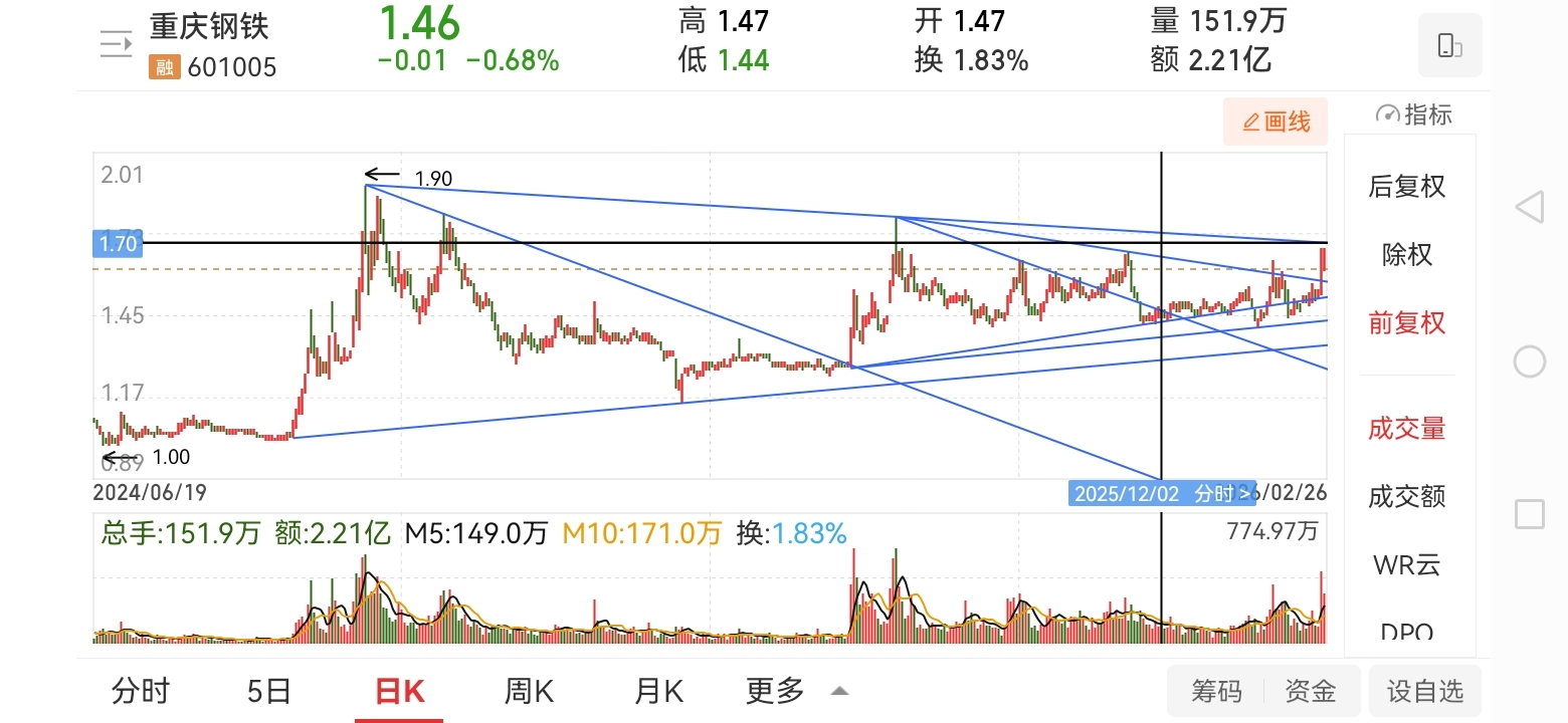 $重庆钢铁(SH601005)$ 只有突破1.7才会加速,目前还在箱体震荡。