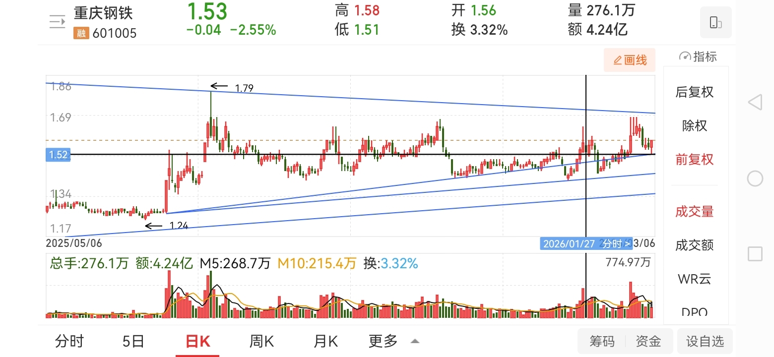 $重庆钢铁(SH601005)$ 回踩1.52拉起,大概率还会二次回踩1.52。耐心等待二次回踩。