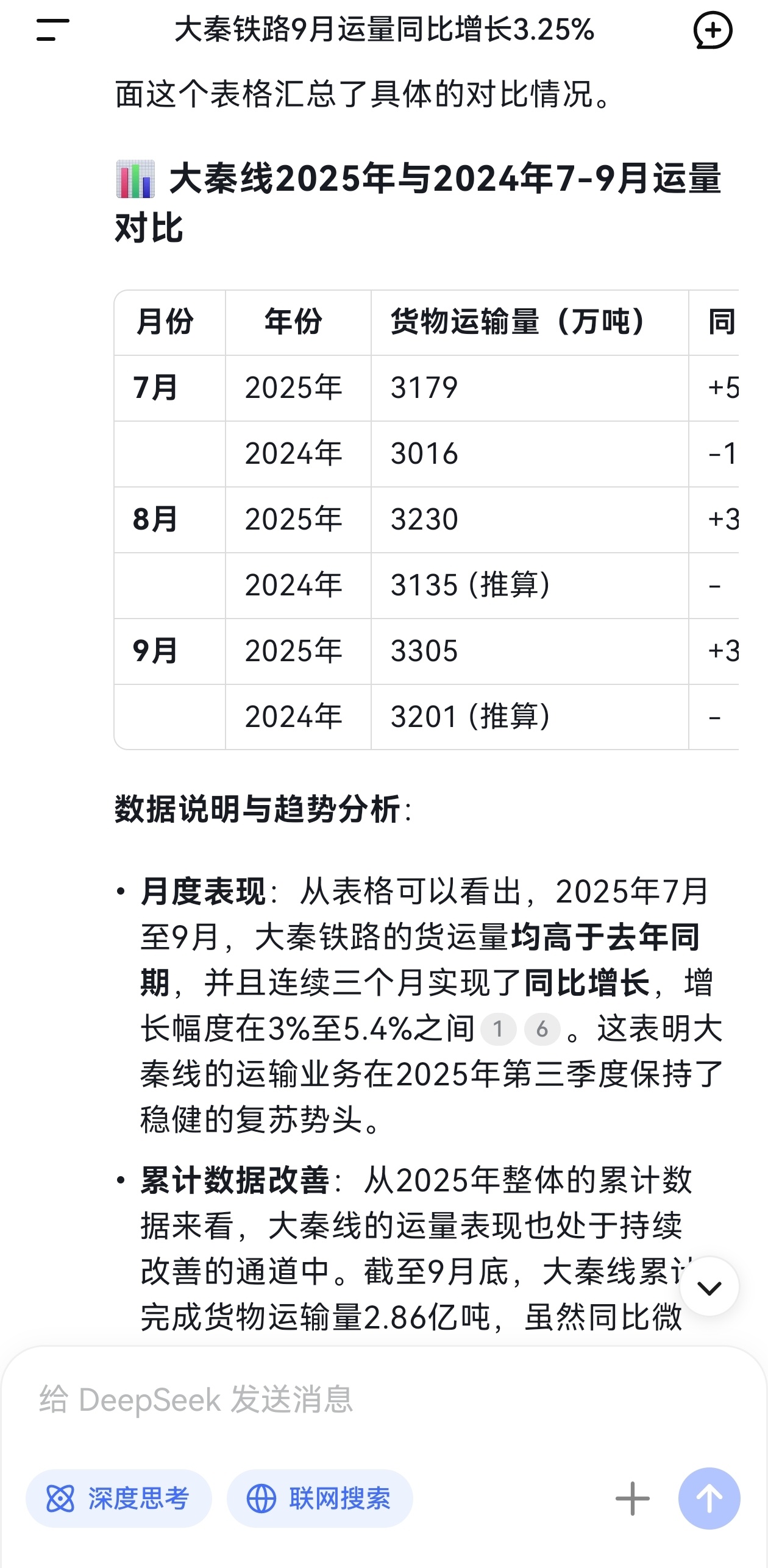 7-9月运量是增长的,10月的运量要11月8日才公布,去年10月也大修,但是去年提前完成大修。四季度和明年一季度预计运量5亿吨。