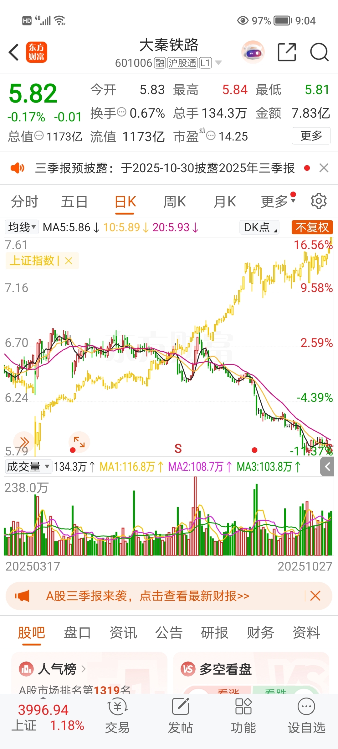 $大秦铁路(SH601006)$ 股价与大盘走势完全相反。