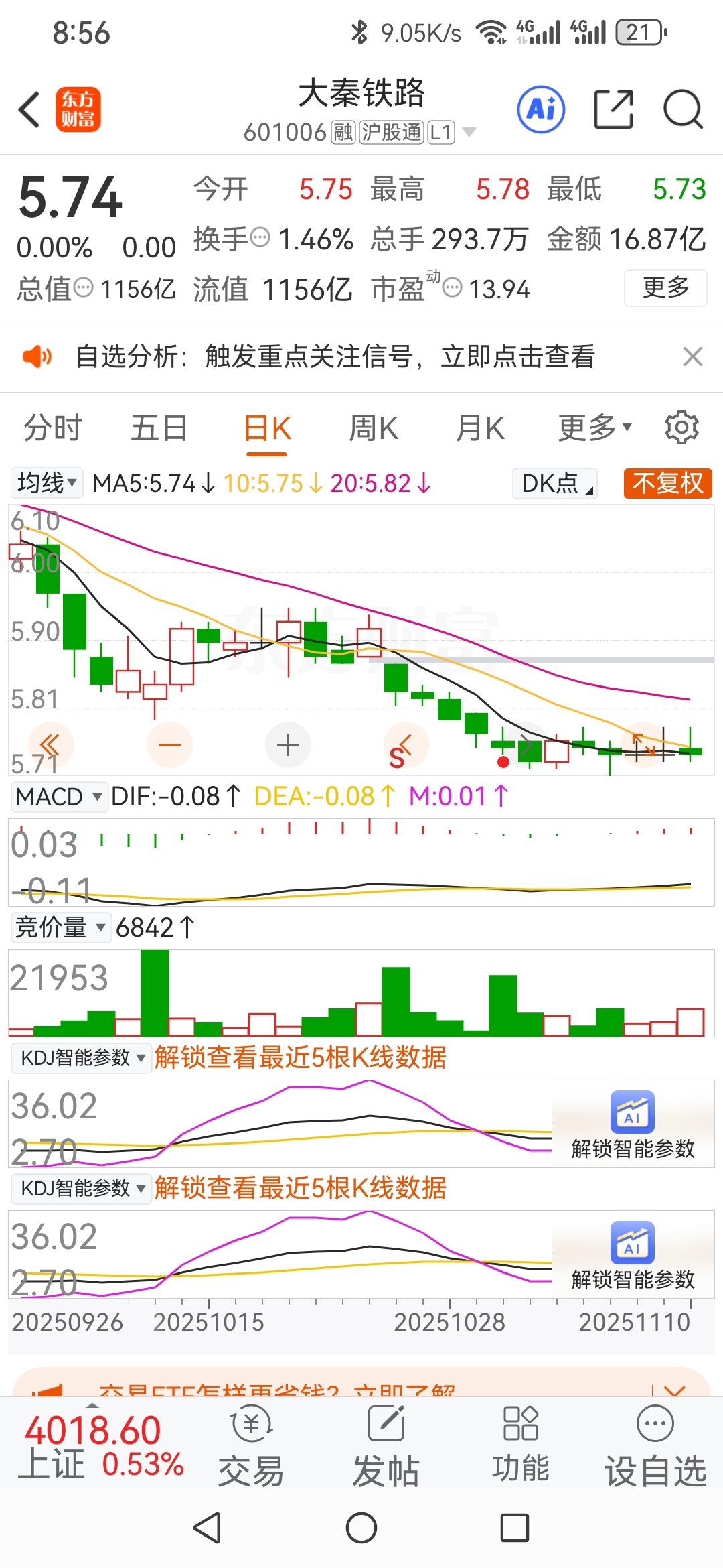 $大秦铁路(SH601006)$ 漂亮的底部图形,明天有望触摸5.82