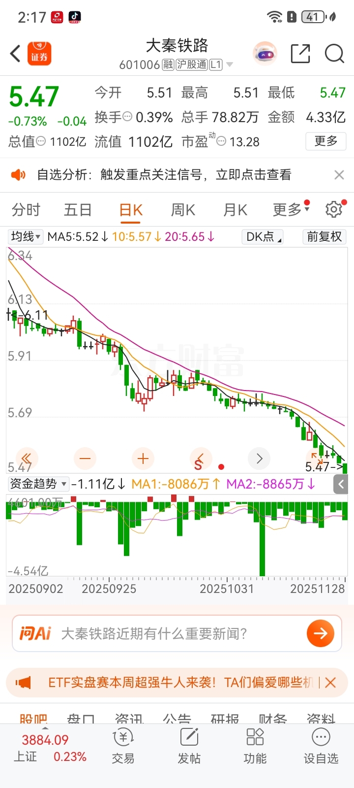 $大秦铁路(SH601006)$ 最低5.47元,明天可以进场抄底了!有不服的吗出来走走!