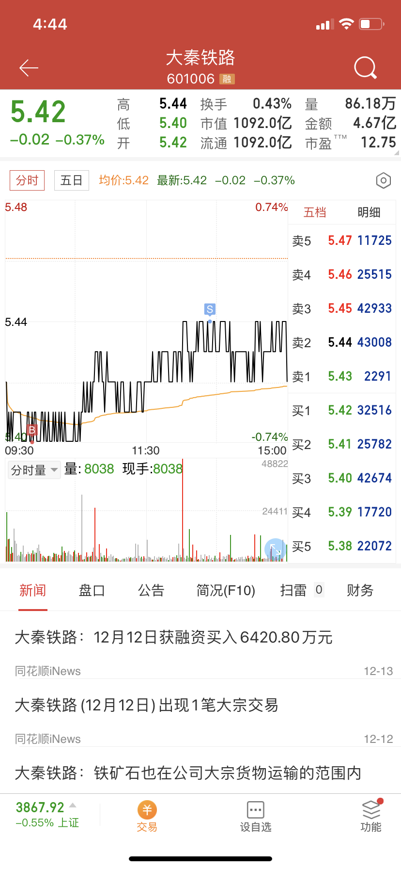 $大秦铁路(SH601006)$ 这股暂时也不会跌到哪里去了,但横盘股价要些时日,现在的策略就是逢低补仓,盘中有机会就做点差,反正持有这股的人百分之99已经都是亏钱的了..没有大利空,也没下杀动力了