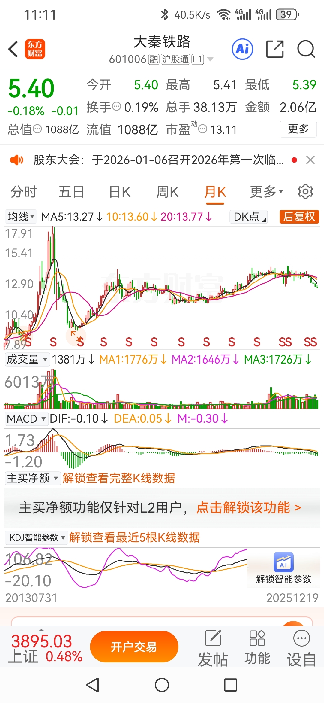 $大秦铁路(SH601006)$ 这是大秦铁路二十年的复权K线图,是上涨换档还是下跌中继呢