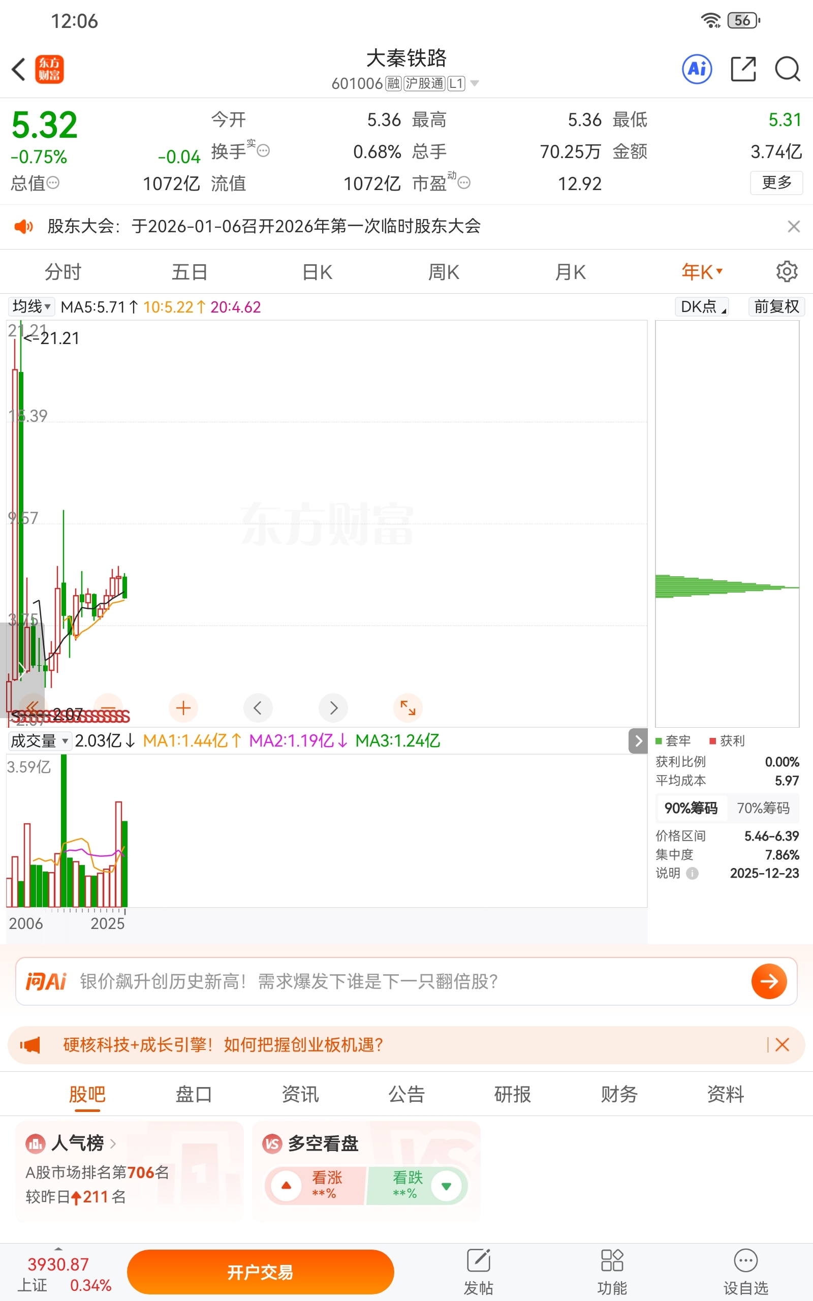 $大秦铁路(SH601006)$ 看看年线,已经连续上涨5年了,今年第一年下跌,这才哪到哪啊,山顶放量,妥妥的顶部结构,还有人跑山顶“抄底
