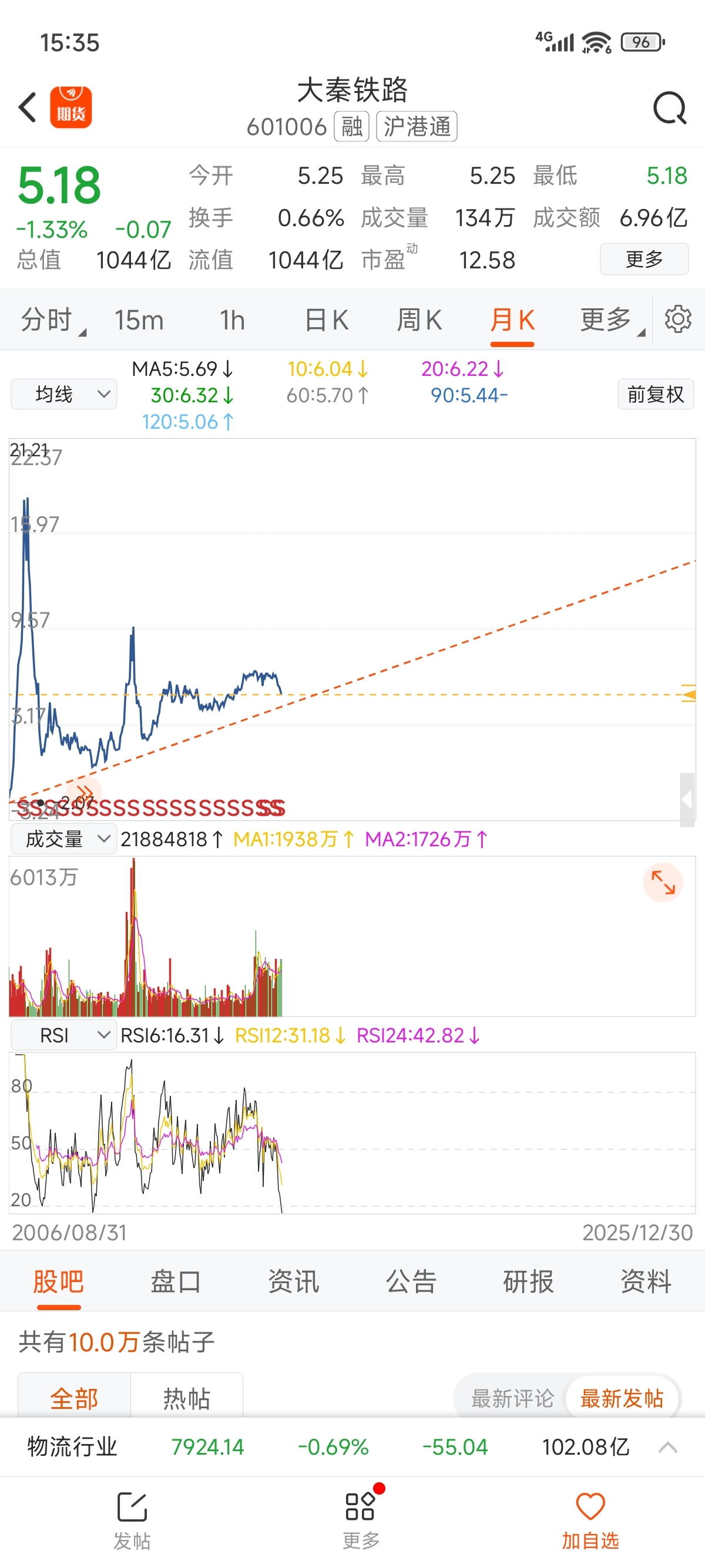 $大秦铁路(SH601006)$ 从月k线看,趋势没坏,估计到4.8左右触及趋势线,应该那时有一波反弹! 现在可以慢慢增仓,不要一下加满