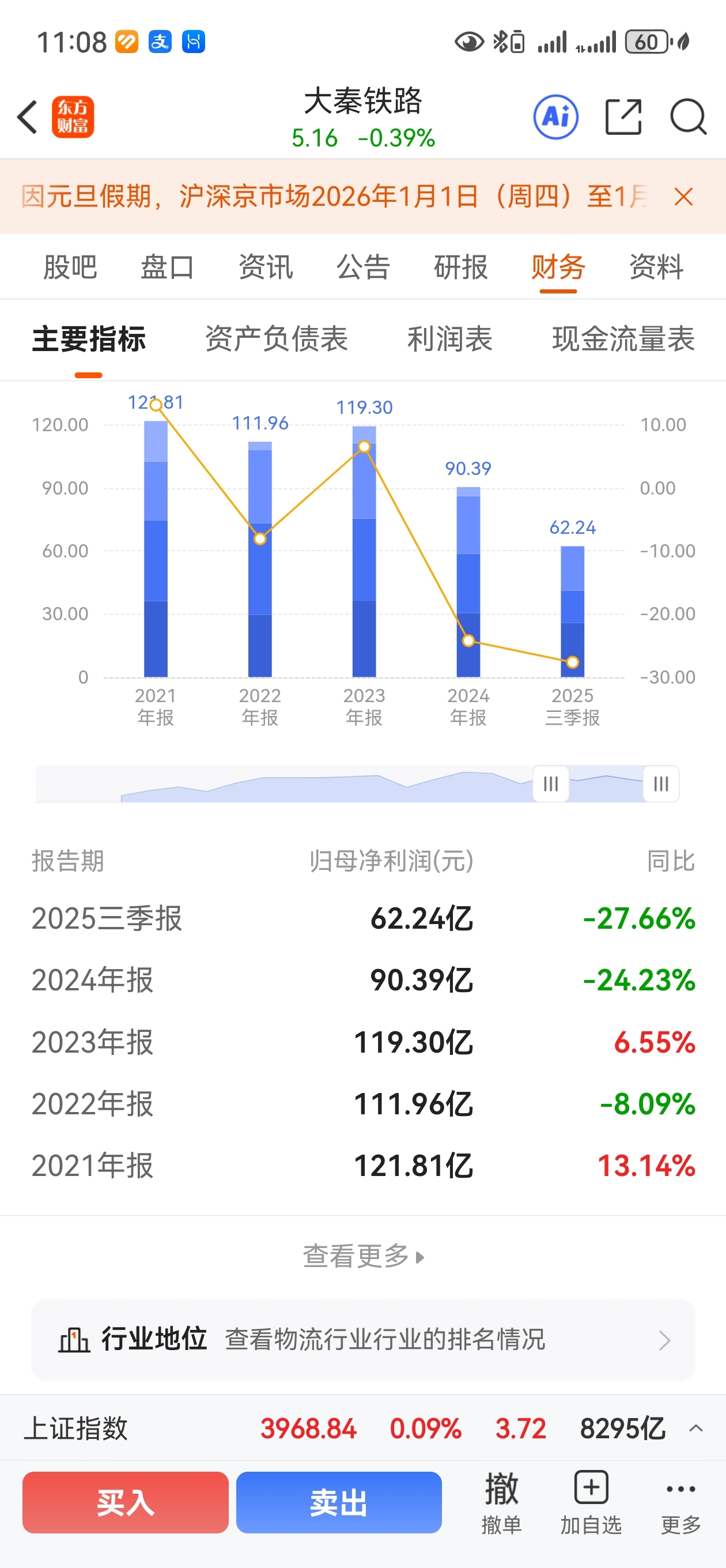 $大秦铁路(SH601006)$ 看一下最近肯定拉两三点,还会跌,业绩不行了,这个吃股息的票,利润不行肯定走。
