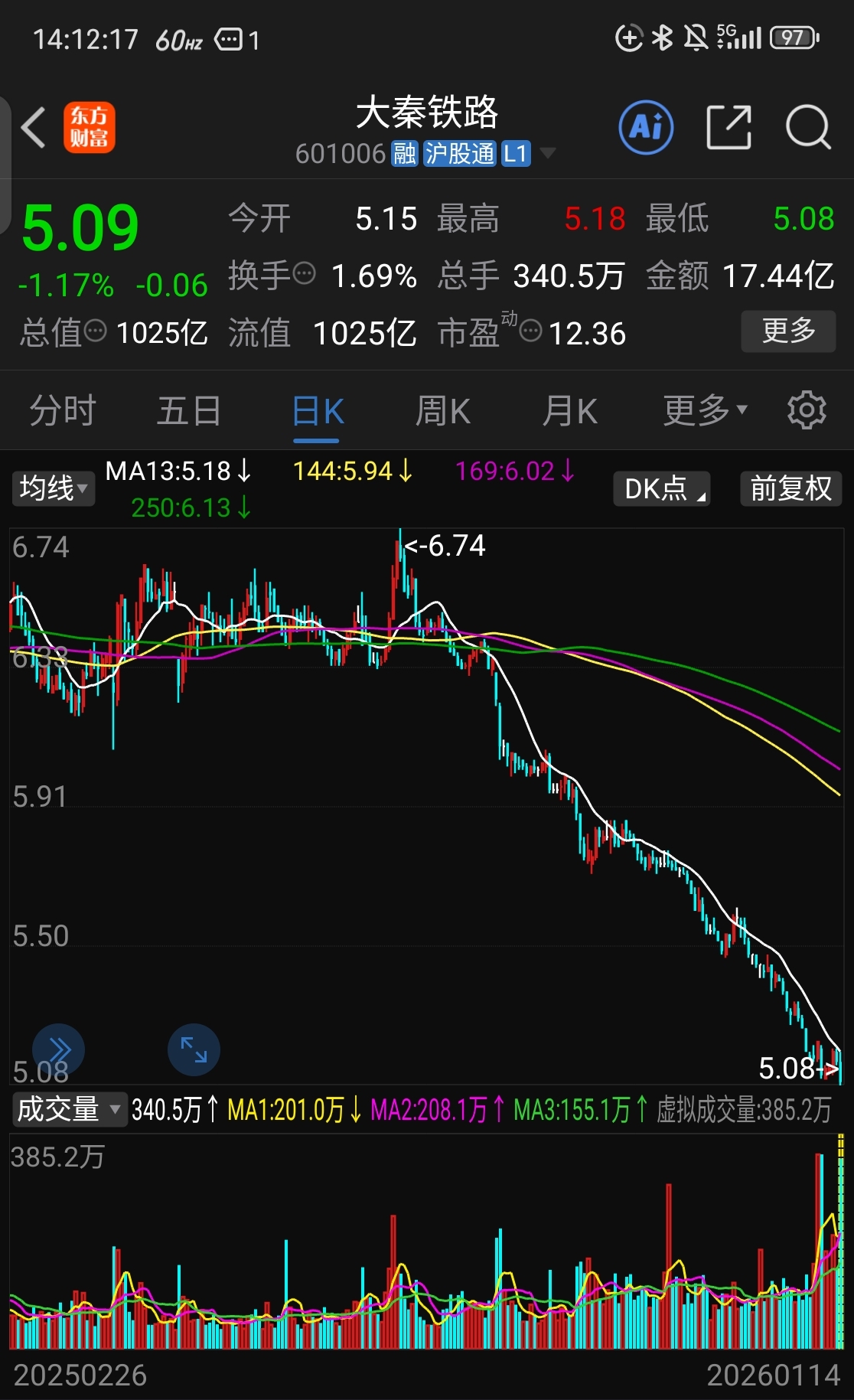 $大秦铁路(SH601006)$ 票是好票,但现在明显均线空头排列,不要介入,等突破回踩144再考虑。目标价在4.6±0.2左右。