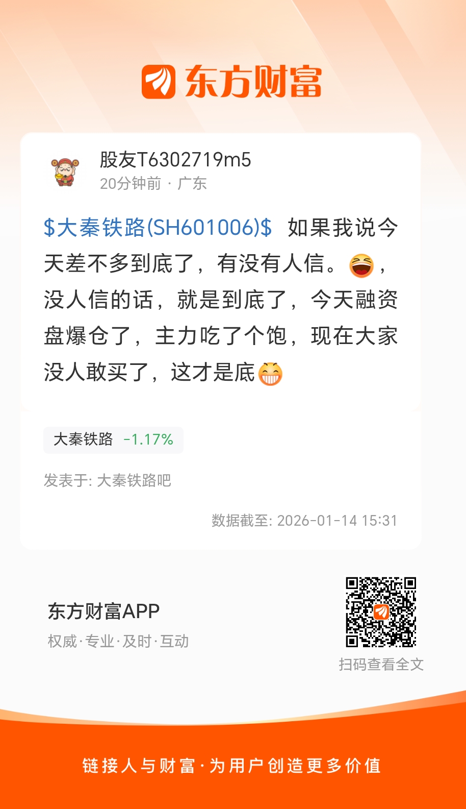 $大秦铁路(SH601006)$ 如果我说今天差不多到底了,有没有人信。