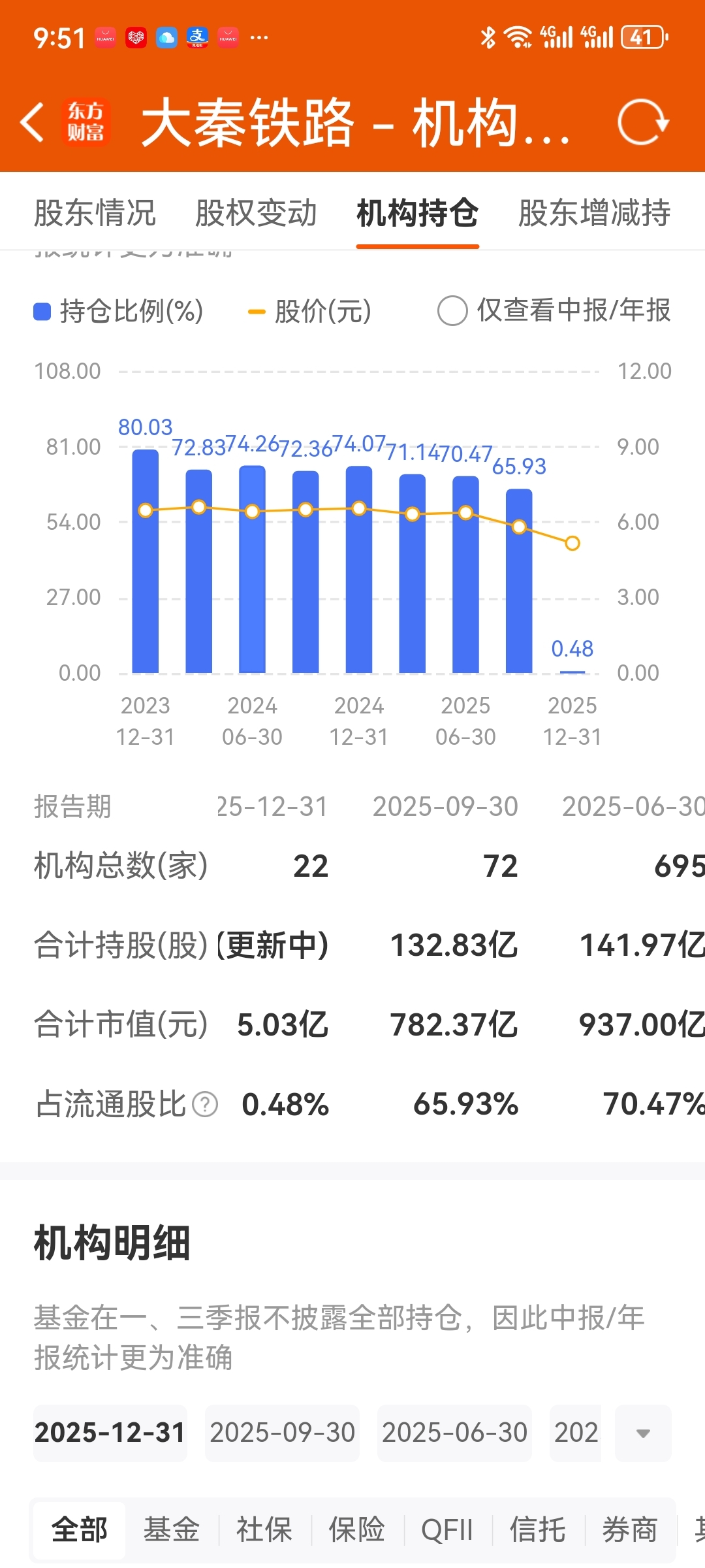 $大秦铁路(SH601006)$ 机构全跑了,只剩散户博杀了
