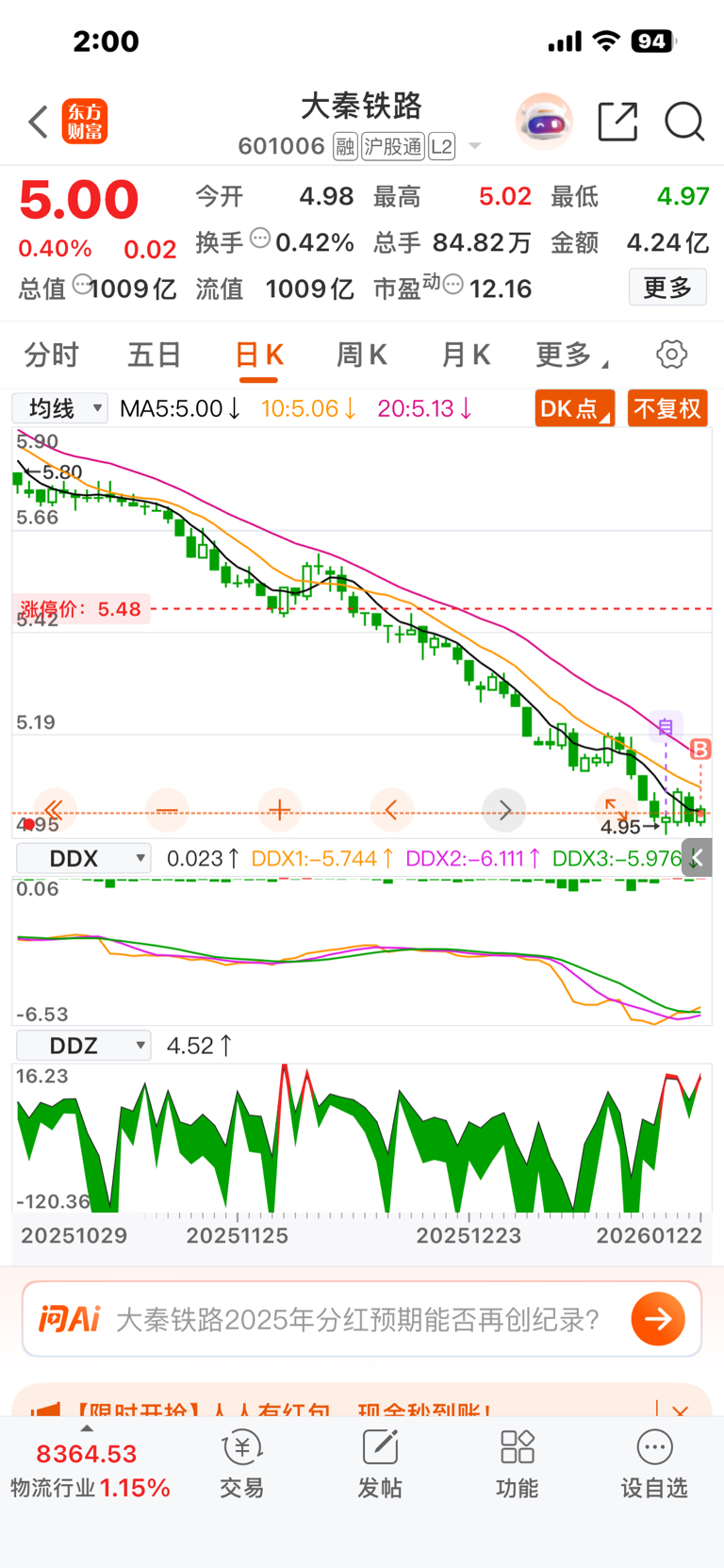 $大秦铁路(SH601006)$ 5元买了100000股!