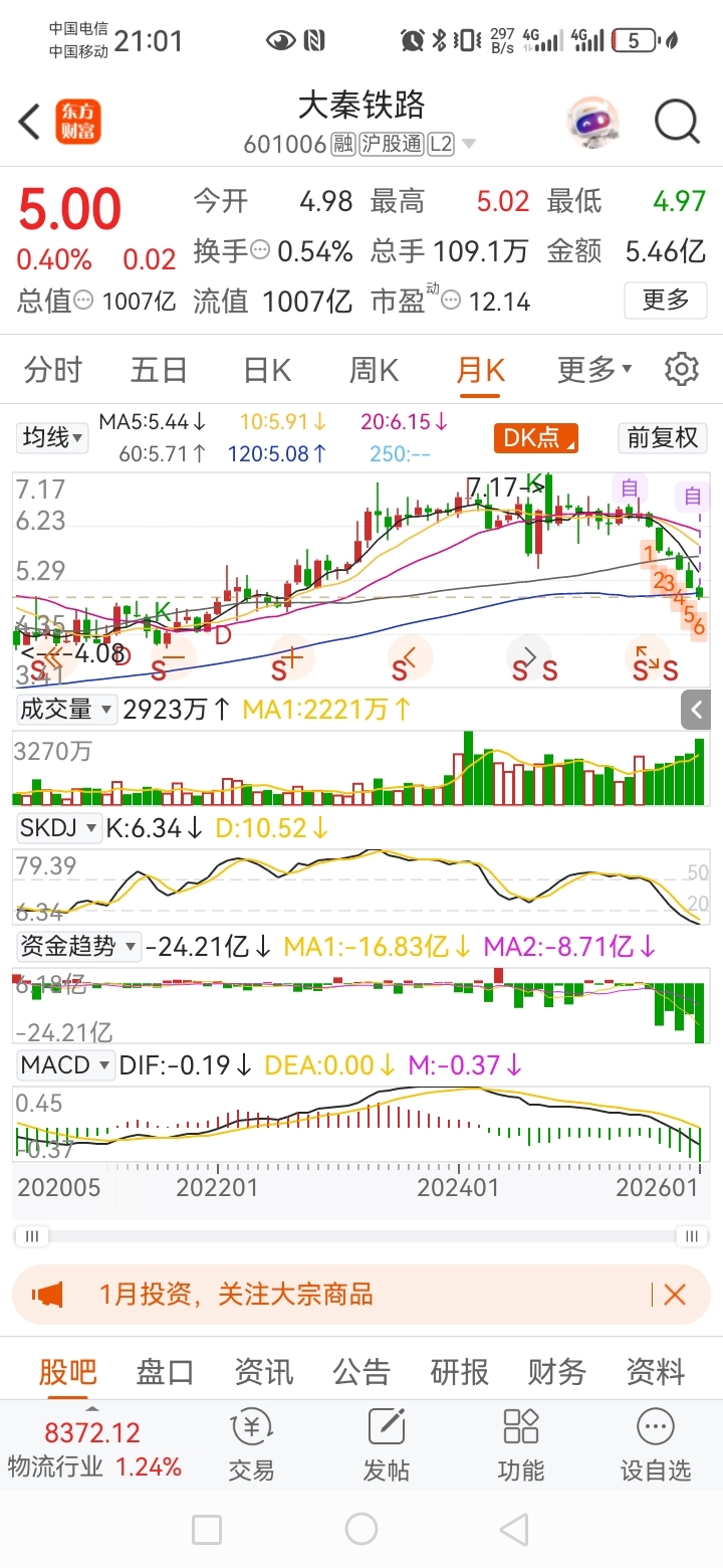 $大秦铁路(SH601006)$ 月线圆弧顶,除非你有无限子弹而且能持有几年,否则千万别轻易抄底