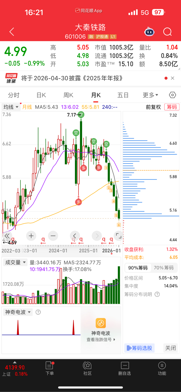 $大秦铁路(SH601006)$ #股市怎么看# 月K下跌走出九转,还被我买到,这是十几年来第一次,希望也是最后一次。