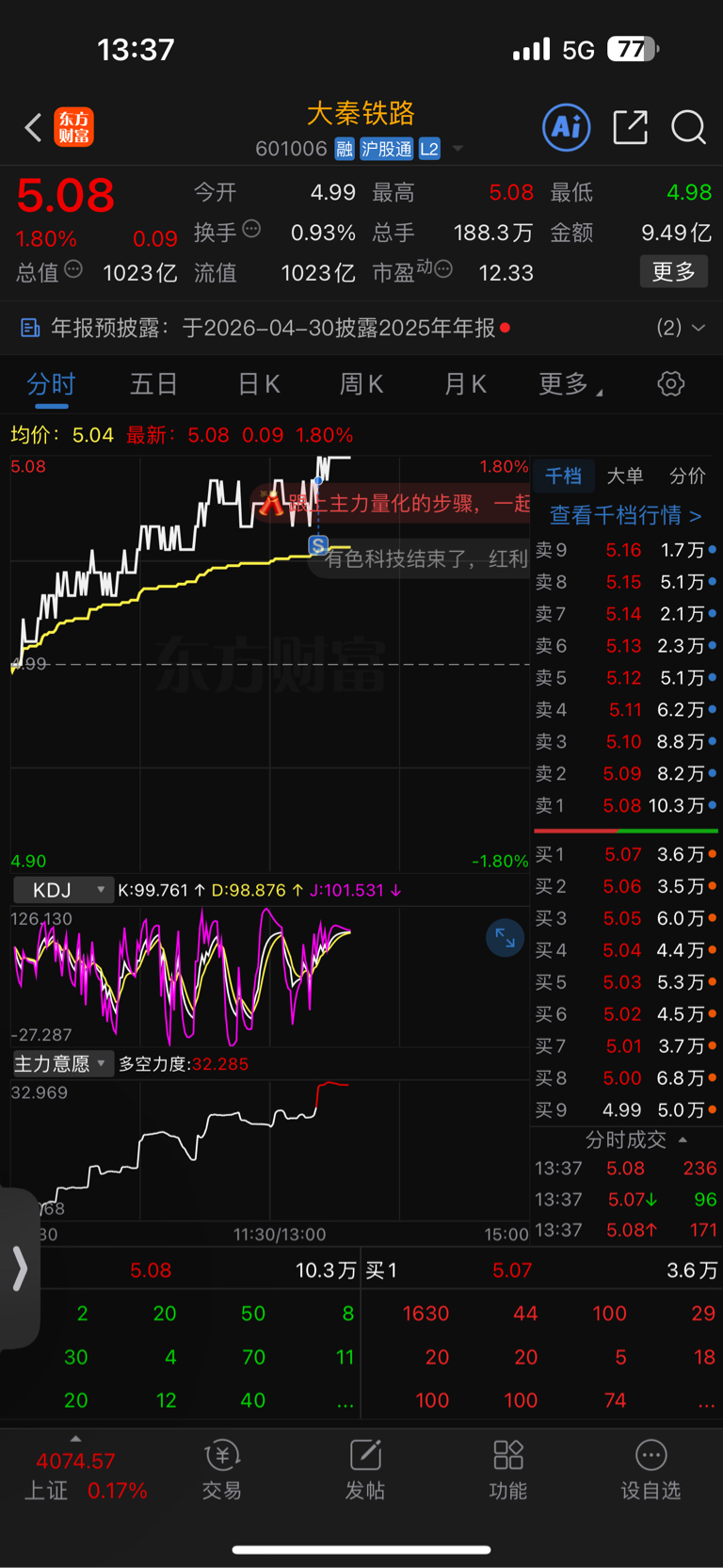 $大秦铁路(SH601006)$ 5.07减了5000股,成本来到了6.09,求求你,明天涨停,让我后悔吧!