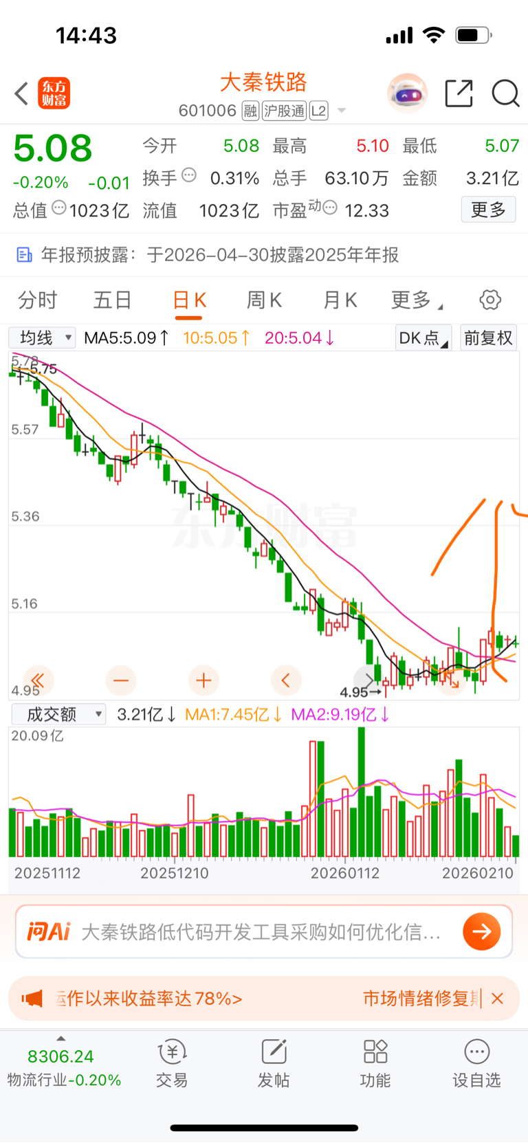 涨停概率很大,均线突破,只欠东风,价值低估,存银行利率1.5%,大秦铁路股息4%