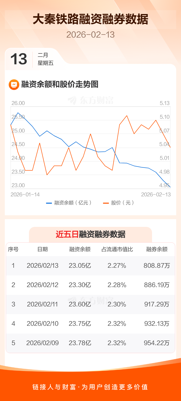 交易所最新数据显示,大秦铁路于2026年2月13日获融资买入3563.11万元,融资偿还6106.24万元,当日融资净偿还2543.13万元。目前,该股融资余额23.05亿,占流通市值比例为2.27%。