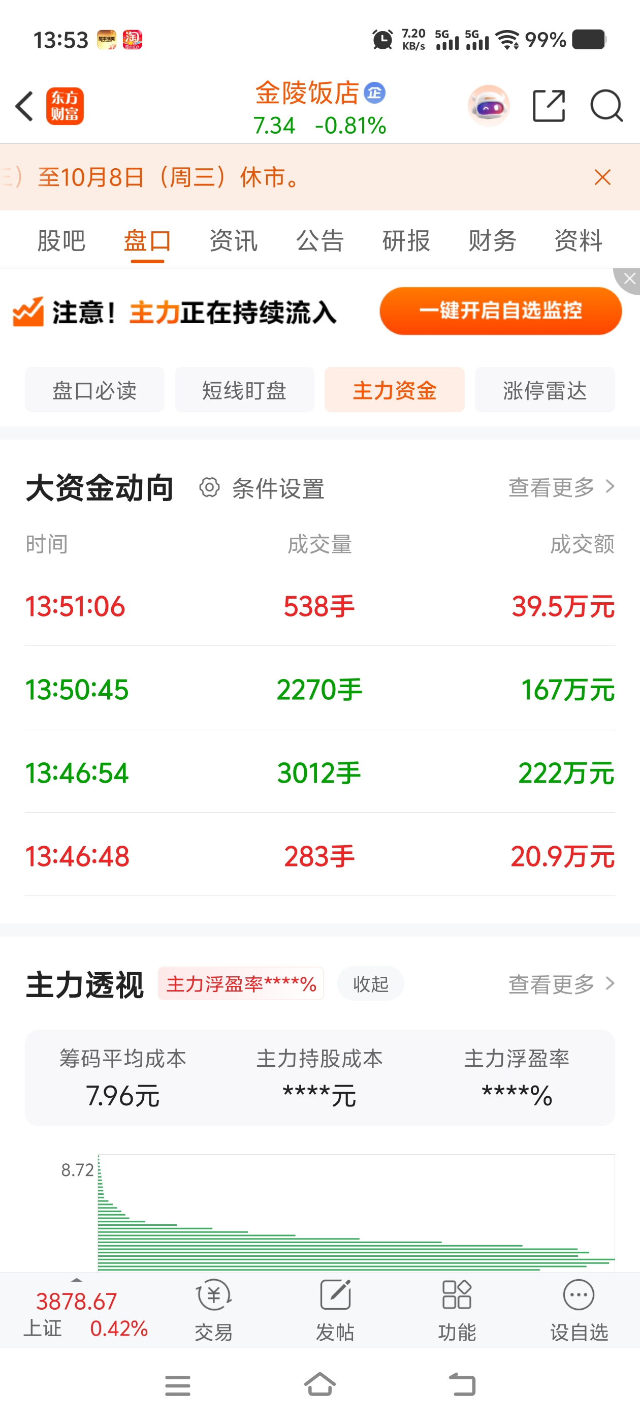 $金陵饭店(SH601007)$ 昨天进的400万,两次砸完了