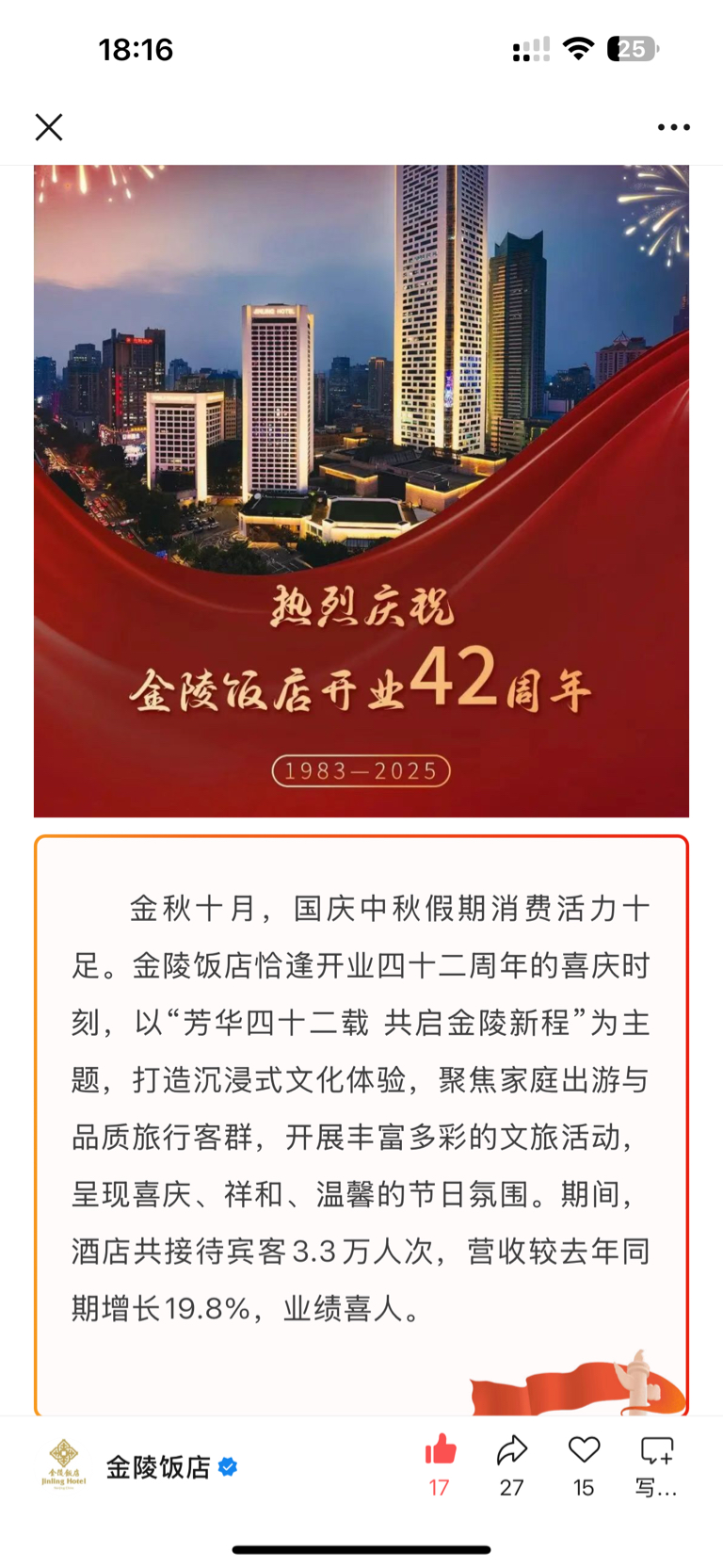 $金陵饭店(SH601007)$ 姐妹们哥哥们业绩喜人呀!感动不
