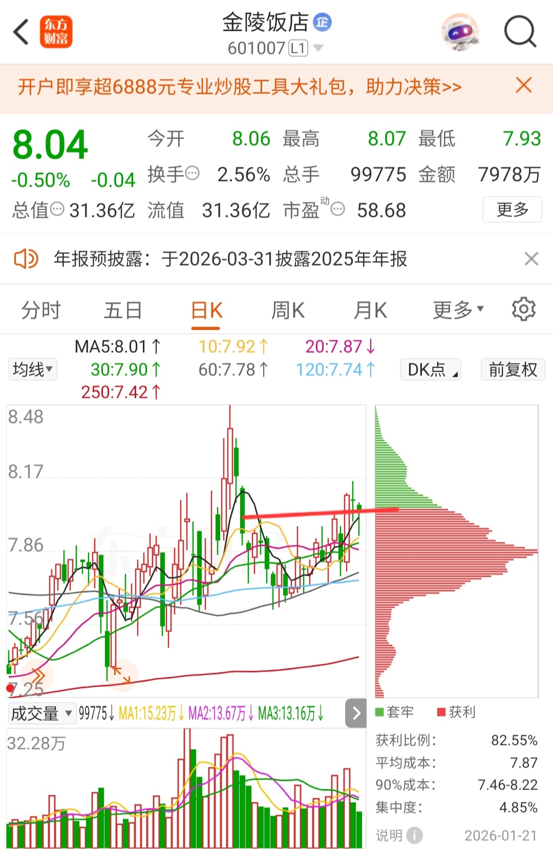 金陵饭店周一放量突破后连续二天缩量强势调整,收盘价在8.03以上说明技术突破有效