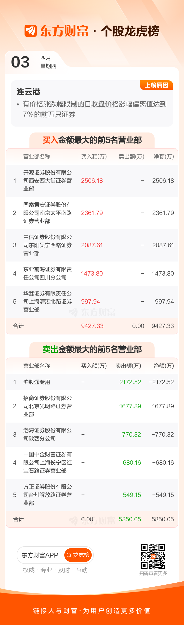 交易所2025年4月3日公布的交易公开信息显示,连云港因成为有价格涨跌幅限制的日收盘价格涨幅偏离值达到7%的前五只证券上榜。连云港当日收报4.25元,涨跌幅10.10%,偏离值10.35%,换手率6.92%,成交额3.58亿。