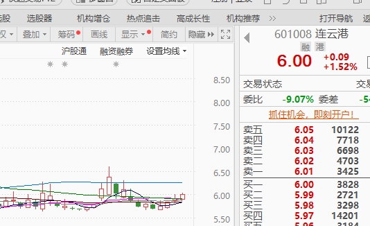 $连云港(SH601008)$ 6元价格买入,K线均金叉排列,主要没有成交量,看看尾盘会不会异动
