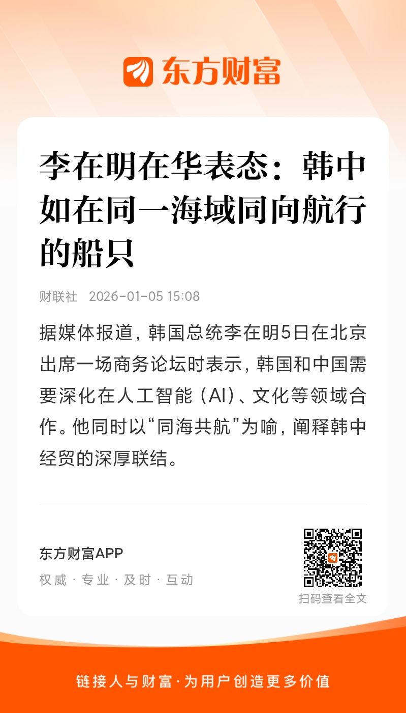 据媒体报道,韩国总统李在明5日在北京出席一场商务论坛时表示,韩国和中国需要深化在人工智能(AI)、文化等领域合作。他同时以“同海共航”为喻,阐释韩中经贸的深厚联结。李在明当天表示,韩中如同在同一海域同向航行的船只,曾携手跨越风浪,通过产业链供应链的深度互嵌相互成就,共同为全球经济增长注入动力。面对当前全球经贸格局变动、技术换代加速、产业链供应链重构难度加大的新形势,若不主动调整方向,仅依赖过往惯性前行,可能会错失发展关键机遇。