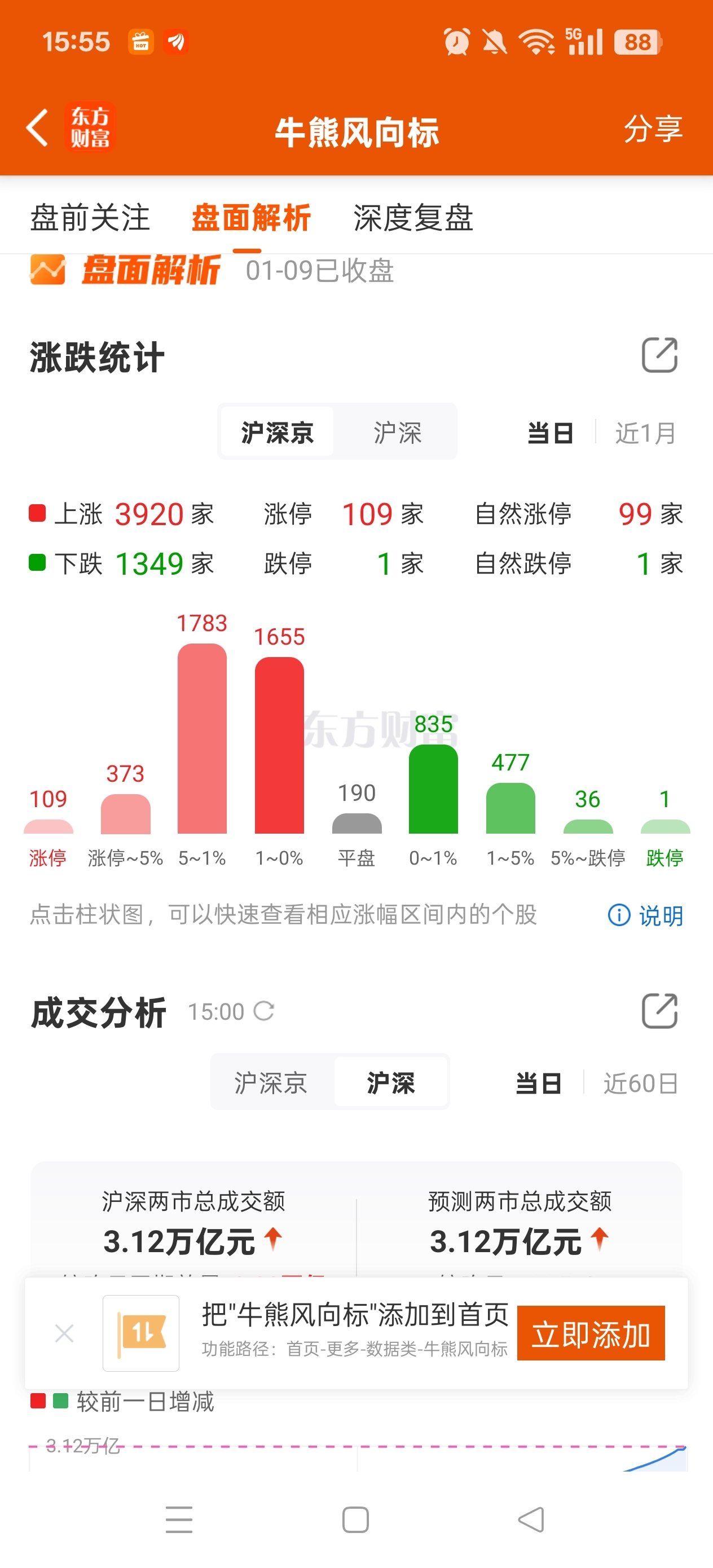 今天是个好日子,16连阳,突破3万亿了,3920家上涨,109家涨停,今年开门红