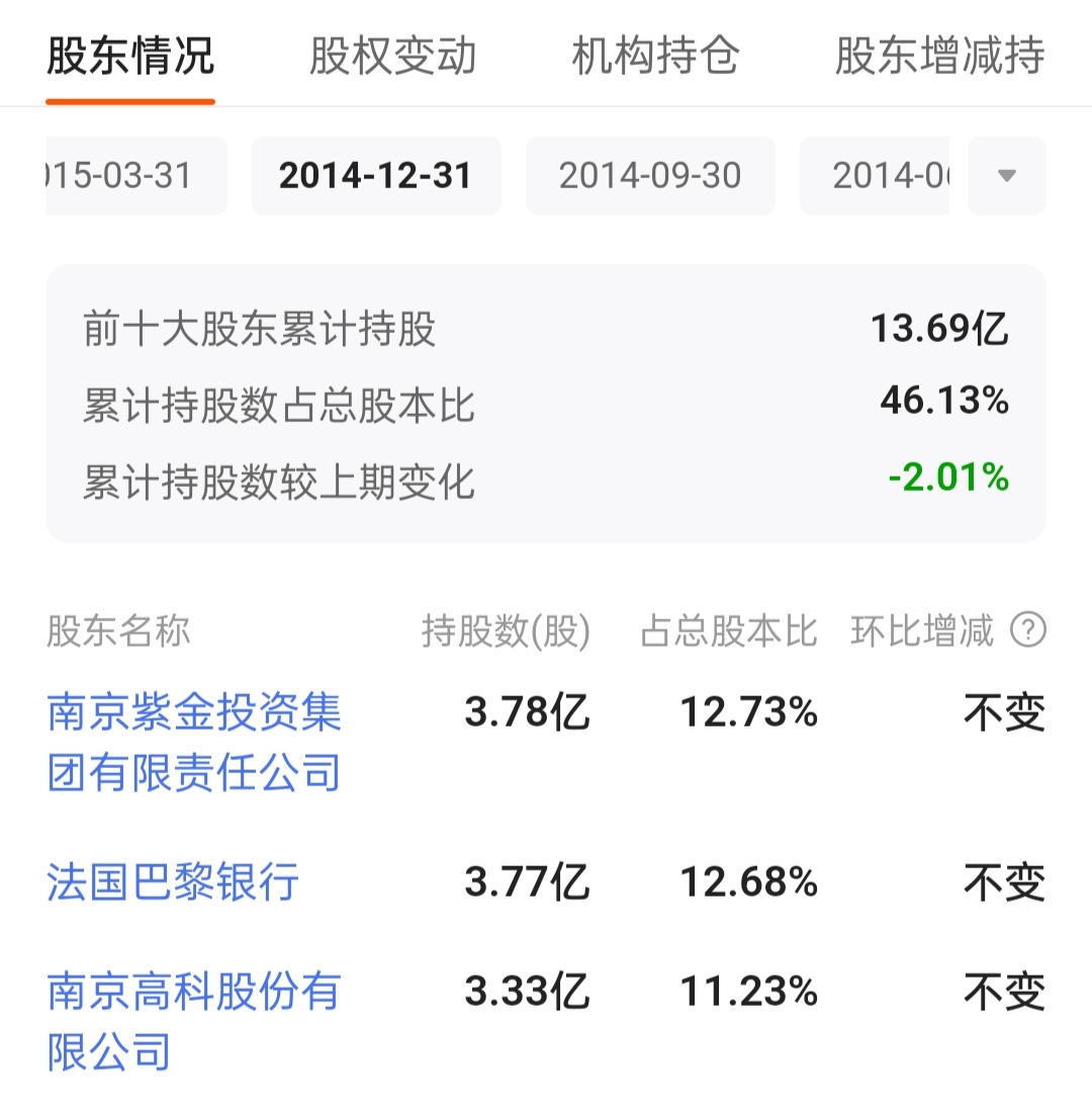 南京银行原始大股东增持,这是一个真实的谎言。从ipo上市之初,真正增加股权的只有法巴一家。银行股基本是左手圈钱右手分红,红利复投股权增值,持股份额不变现金回报极少,南行2007年上市以来,经过配股,紫金集团股权划转社保,同期也增持股份,2014年底十大股东可真实反映原大股东座次