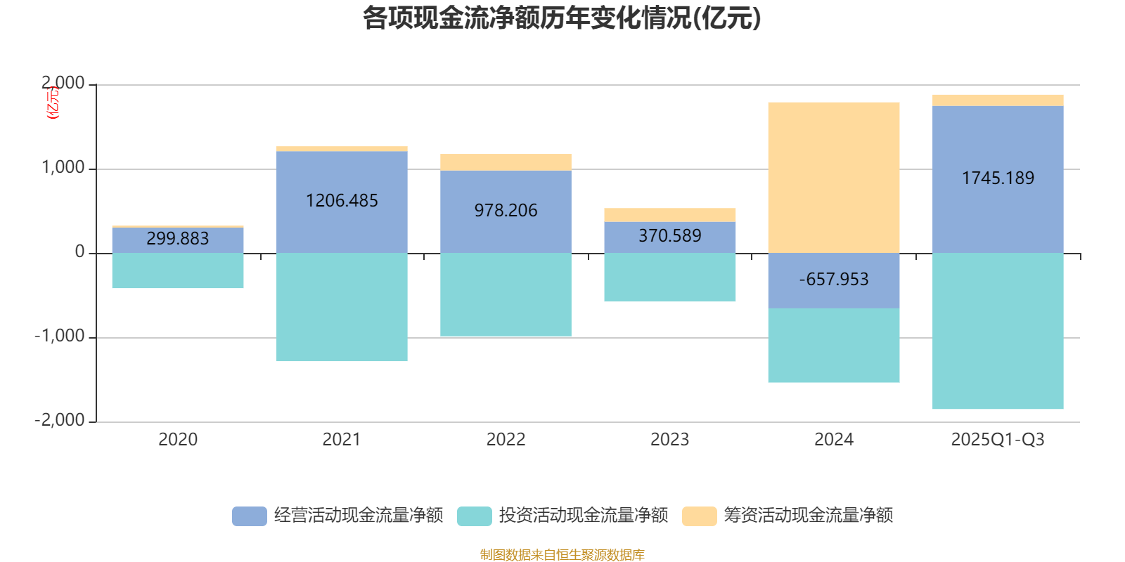 2025年前三季度,公司经营活动现金流净额为1745.19亿元,同比增加2490.78亿元;筹资活动现金流净额130.62亿元,同比减少1687.2亿元;投资活动现金流净额-1851.87亿元,上年同期为-857.62亿元。