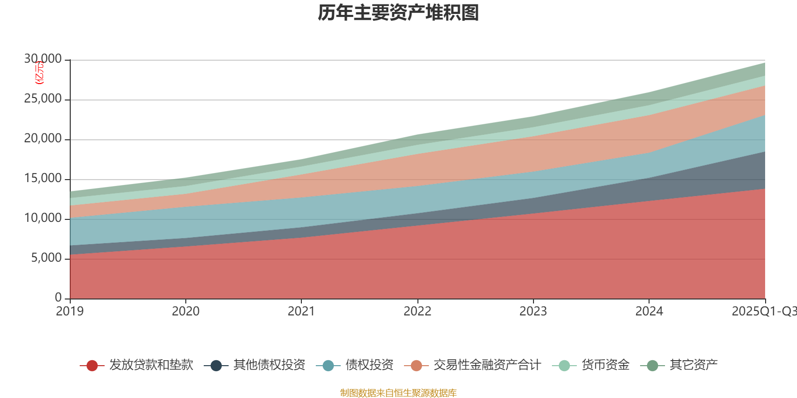 资产重大变化方面,截至2025年三季度末,公司交易性金融资产合计较上年末减少21.54%,占公司总资产比重下降5.71个百分点;其他债权投资较上年末增加60.42%,占公司总资产比重上升4.53个百分点;债权投资较上年末增加46.14%,占公司总资产比重上升3.38个百分点;发放贷款和垫款较上年末增加12.52%,占公司总资产比重下降0.74个百分点。