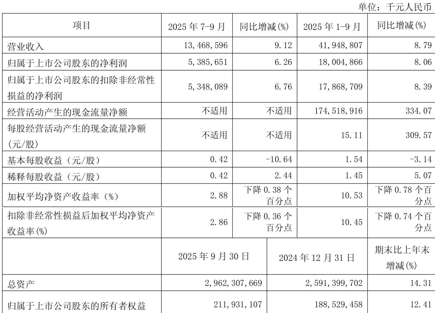 中证智能财讯南京银行(601009)10月28日披露2025年第三季度报告。前三季度公司实现营业总收入419.49亿元,同比增长8.79%;归母净利润180.05亿元,同比增长8.06%;扣非净利润178.69亿元,同比增长8.39%;经营活动产生的现金流量净额为1745.19亿元,上年同期为-745.59亿元;报告期内,南京银行基本每股收益为1.54元,加权平均净资产收益率为10.53%。