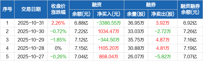 南京银行:融资净偿还3386.55万元,融资余额6.88亿元(10-31)