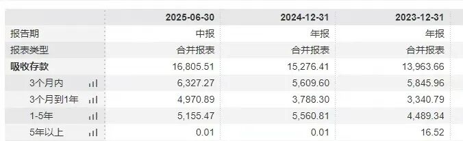 值得注意的是,截至2025年6月末,在南京银行超万亿规模的金融投资组合中(包含公允价值计量金融资产、债权投资及其他债权投资),1-5年期限5245亿,5年以上3987亿,二者合计占比超过七成;而负债端一年以内短期存款占比又超65%,形成典型的“短借长投”期限错配格局。