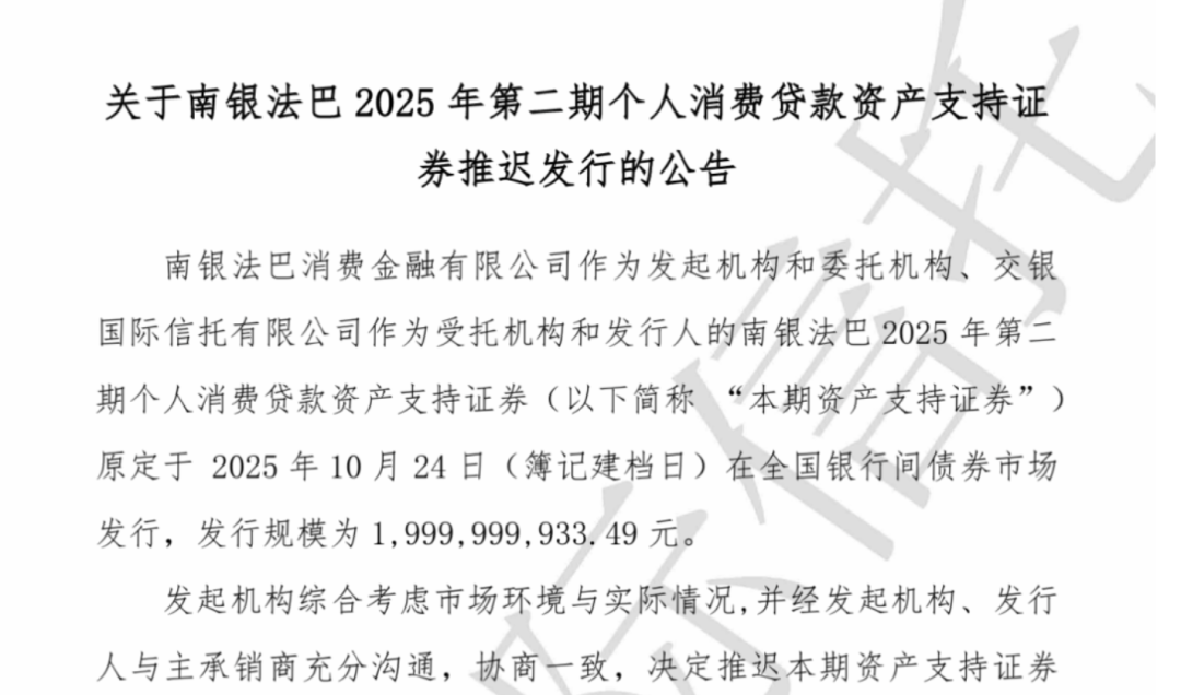 更引人关注的是,南银法巴的核心融资渠道之一突然“断档”:原定2025年10月下旬发行的20亿元第二期个人消费贷款ABS,于发行前一日突然公告推迟,成为持牌消金公司首例此类情况。据悉,ABS发行是南银法巴重要的低成本融资渠道,2024年至2025年上半年已发行三期ABS合计超54亿元。