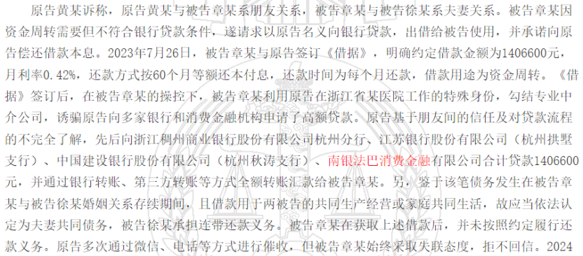 更值得警惕的是,南银法巴还存在违规转贷情况。所谓转贷,即是那些自身征信情况通不过贷款机构审核的人(实际用款人),由其他征信记录良好的人或中介机构(中间人)借款出来再转借给实际用款人,由实际用款人后续履行还款付息义务。但这类实际用款人本身就是征信风险较高的人群,还款能力相对较弱,后续一旦出现违约,便会形成连锁反应,导致中间人向金融机构的贷款违约。在中国裁判文书网上,案号(2025)豫1621民初4739号、(2024)浙0102民初20684号的裁判书均显示,部分涉案资金系由中间人向南银法巴转贷而来,最终却因实际用款人违约而导致了法律纠纷。