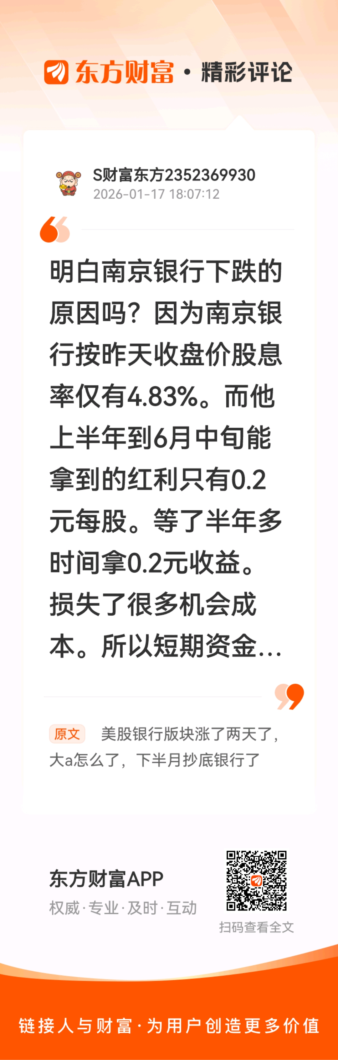 //@S财富东方2352369930 :明白南京银行下跌的原因吗?因为南京银行按昨天收盘价股息率仅有4.83%。而他上半年到6月中旬能拿到的红利只有0.2元每股。等了半年多时间拿0.2元收益。损失了很多机会成本。所以短期资金呆不住了。但是股价越接进10元。大资金就会来接盘。因为全年5%以上的资金收益对大资金是很难觅到的。江苏银行,上海银行都和他差不多。10元以下会有大资金收割。浦发银行去年红利只有0.4元,今年可能会提高到0.5元。但股价只有进到10元,收益率才会进5%。所以应该与上面三个股看齐。