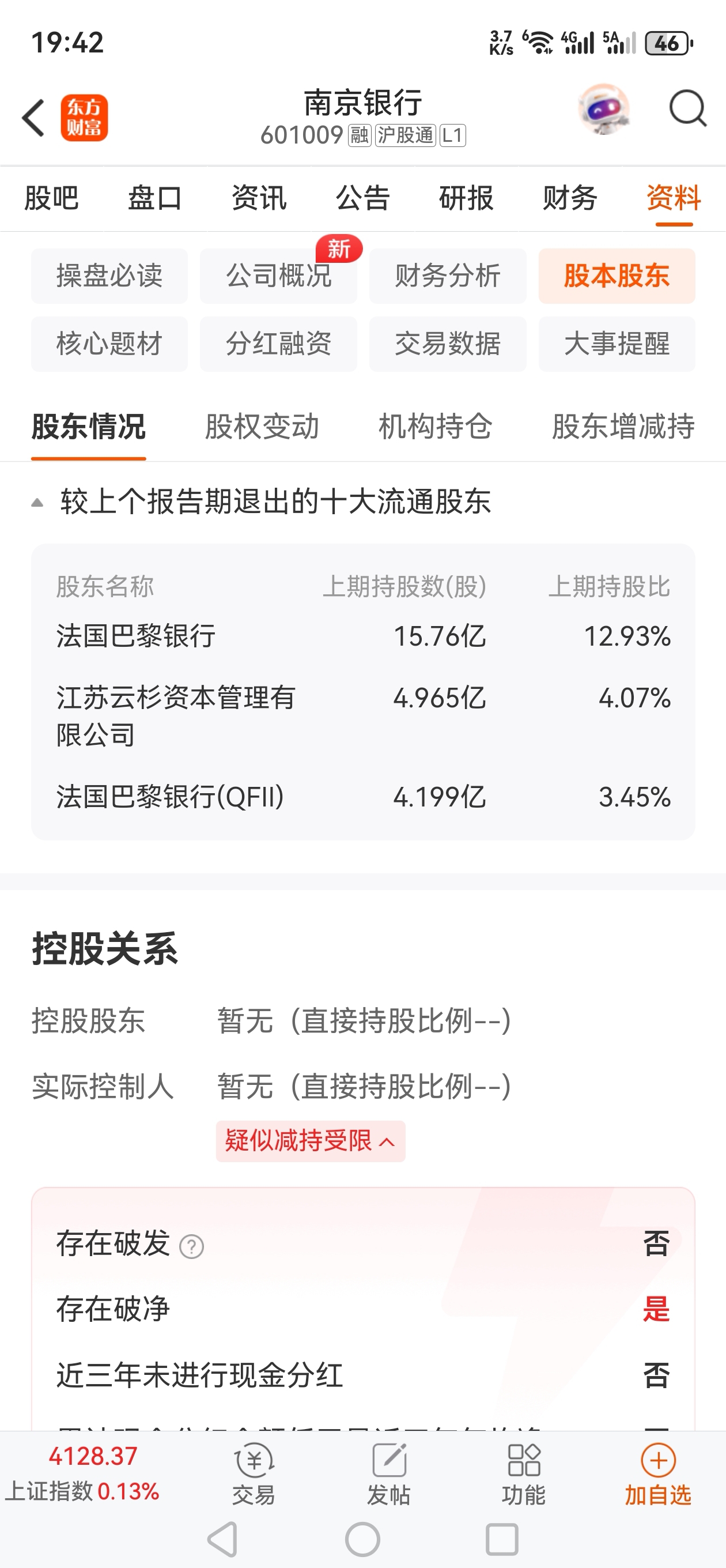 $南京银行(SH601009)$ 谁能看懂东方财富显示的南京银行资料?法国巴黎银行退出?