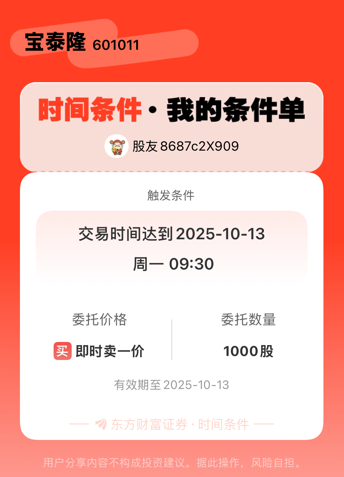 #条件单交流#  一位股神设置了一个时间条件条件单,接下来就是见证奇迹的时刻~$宝泰隆(SH601011)$