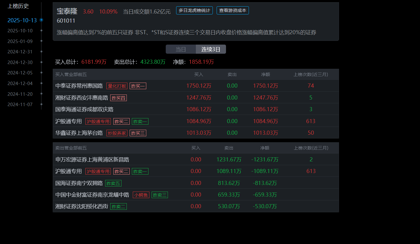 宝泰隆今日游资龙虎榜席位上榜数据如下!
